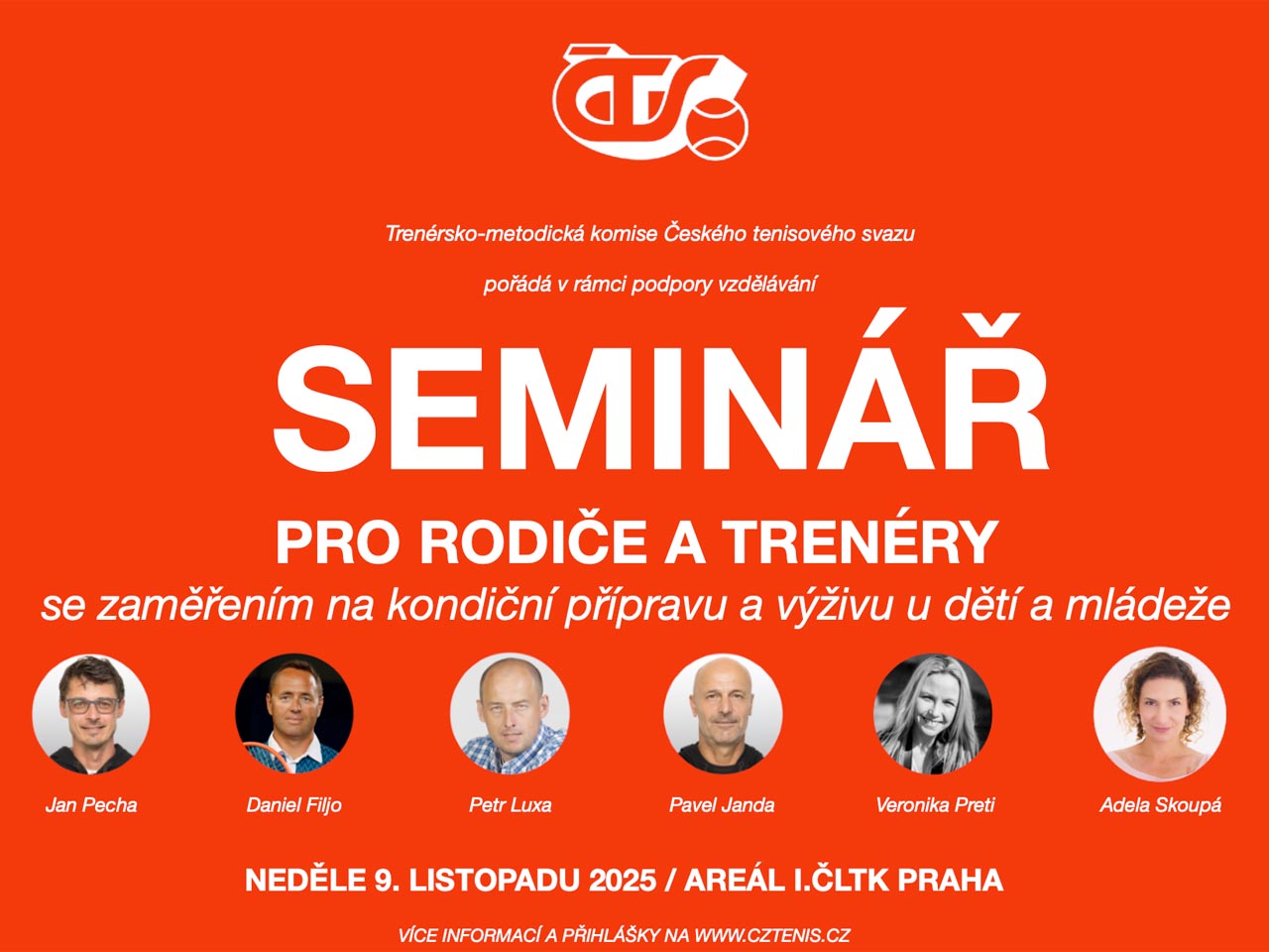 V neděli 9. listopadu 2025 se v areálu I.ČLTK Praha na ostrově Štvanice uskuteční teoreticko-praktický seminář pro rodiče a trenéry. Seminář se zaměřuje na dlouhodobou koncepci tenisové přípravy, se zaměřením kondiční přípravu a výživu dětí a mládeže. Garantem semináře je člen TMK ČTS a vedoucí trenér tenisové školy Markéty Vondroušové Jan Pecha, mezi dalšími přednášejícími se představí sportovní manažer a bývalý hráč Petr Luxa, šéftrenér TK Sparta Praha Daniel Filjo, kondiční trenér I.ČLTK Praha Pavel Janda a specialistky na výživu Veronika Preti a Adela Skoupá. Akce je pro účastníky zdarma, během semináře je pro všechny připraven brunch v místní restauraci. Přihlášení zde.
